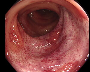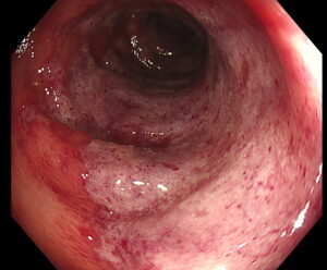 痛みと血便が同時に起こる点が特徴です。感染性腸炎や潰瘍性大腸炎と似ているため、大腸内視鏡検査による鑑別が欠かせません。